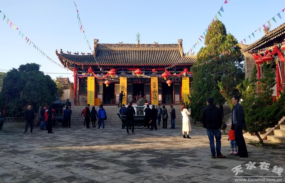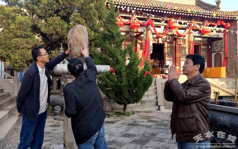 位于麥積區(qū)渭南鎮(zhèn)的卦臺(tái)山是采風(fēng)團(tuán)當(dāng)天的第一站。卦臺(tái)山如一條巨龍從群巒中探出頭來,翠擁廟閣,渭水環(huán)流,鐘靈毓秀,氣象不凡。作家詩人們沿臺(tái)階向上,登臨卦臺(tái)山頂,俯瞰三陽川。古老的渭河從西向東彎曲成一個(gè)“S”形,把橢圓形的三陽川盆地一分為二,形成了一個(gè)天然的太極圖。采風(fēng)團(tuán)在卦臺(tái)山伏羲廟內(nèi)參觀祭拜,又一次紛紛感嘆天水的人杰地靈!暗堑缴巾敳虐l(fā)現(xiàn)大不同,卦臺(tái)山名不虛傳!弊骷谊悅}(cāng)精神十足,一邊稱贊,一邊讓朋友為他拍下與卦臺(tái)山的合影。