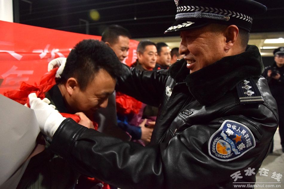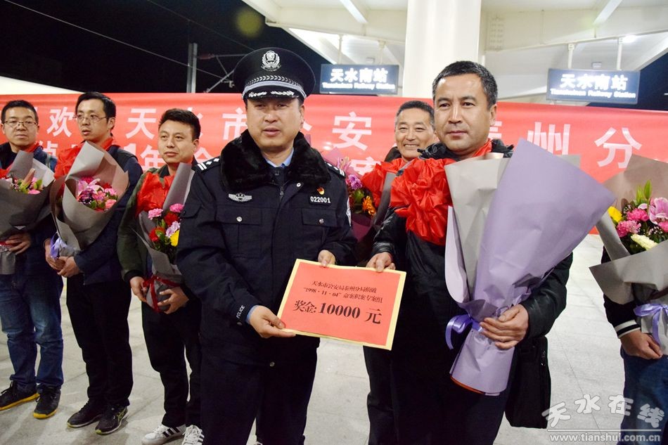 省市區(qū)三級公安機(jī)關(guān)領(lǐng)導(dǎo)在天水南站舉行儀式,歡迎秦州分局偵破21年命案專案組凱旋,并給專案組民警送上鮮花和獎(jiǎng)金,對大家連日來辛勤工作所取得的成績給予肯定和贊揚(yáng)。