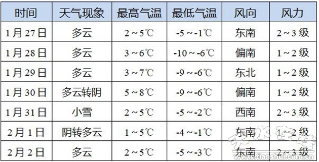 【摘要】預計1月27日~2月2日天氣以多云為主,其中30日夜間到31日白天,我市有一次降雪(雨夾雪)天氣過程,量級以小雪為主,白天城區(qū)為雨夾雪。受降雪影響,預計部分路段將出現(xiàn)不同程度的積雪和道路結冰,對春運交通運輸有不利影響。