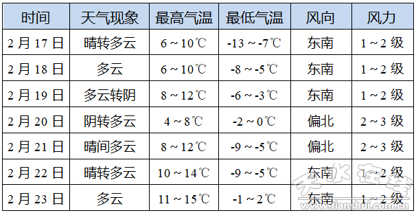 【摘要】預計2月17日~23日我市天氣以多云為主,有利于春運工作。其中19日夜間我市東北部鄉(xiāng)鎮(zhèn)有陣雪,對交通運輸有不利影響。
