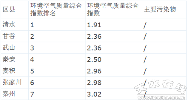 6月份,各縣區(qū)環(huán)境空氣質(zhì)量綜合排名由好到差分別為清水縣1.91、甘谷縣2.36、武山縣2.36、秦安縣2.50、麥積區(qū)2.96、張家川縣2.98、秦州區(qū)3.02。