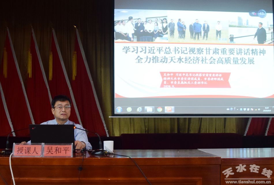 天水市委講師團成員、市委直屬機關(guān)工委副書記吳和平以學習貫徹落實習總書記視察甘肅時的重要講話精神,努力推動天水經(jīng)濟社會高質(zhì)量發(fā)展為題展開專題宣講。