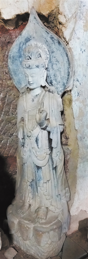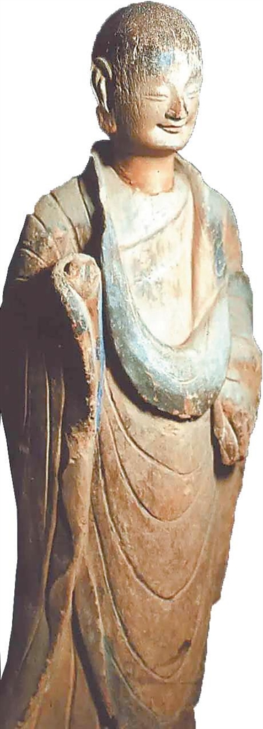 在窟內(nèi)第九龕,靜靜地立著一個小沙彌,高不足一米,造型簡潔質(zhì)樸。面目形象就如一個不滿十歲的孩童,頭略下低,眉宇間尚未脫去孩童天真無邪的稚氣,臉上的喜悅和羞澀的神情被刻畫得惟妙惟肖,十分逗人喜愛。這是一身形象刻畫和心理描繪都非常出色的泥塑作品,北魏時期的工匠所塑作品在經(jīng)歷了千余年的時空變幻后,仍能深深打動我們的心靈,可謂是藝匠巧手。(圖①)