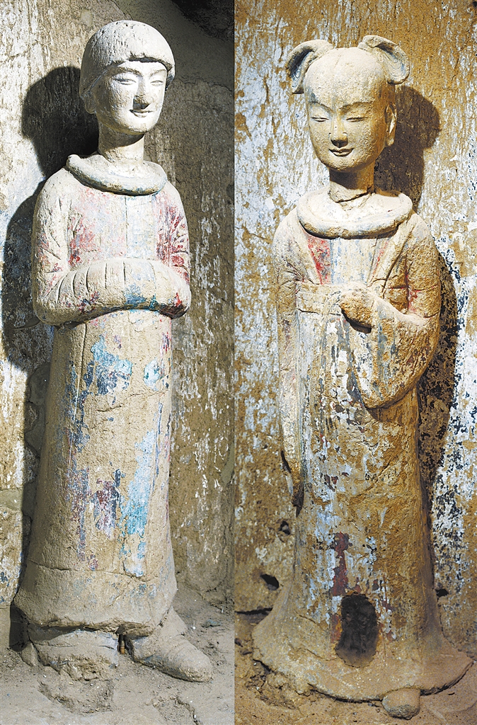 女童身材窈窕,與男童相向而立。女童面容細嫩,前額梳著劉海,環(huán)形丫髻偏向兩邊,顯得非常可愛,又極具特色,眼睛微閉,眉毛彎曲,鼻直有棱,嘴角內(nèi)收,雙唇半啟,露出甜蜜的笑容,是個典型的農(nóng)村小女孩的相貌。她一手下垂,一手提帶,姿態(tài)生動自然。身穿圓領(lǐng)寬袖衫,穿長裙,裙擺落地呈喇叭形,露出鞋尖,顯得比童男更帶稚氣。