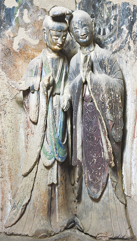 這兩尊塑像緊緊地靠攏在一起,似乎在竊竊私語。菩薩身材修長,細頸削肩,頭束扇形高髻,身穿“褒衣博帶”式上衣,下著長裙,肩披寬邊大披巾,足穿云頭履,斜倚弟子,頭略低俯,似在傾吐衷曲。緊貼菩薩身旁的弟子,身穿翻邊雙領(lǐng)下垂的袈裟,內(nèi)著僧祗衣,下系長裙,微向菩薩傾斜的頭部、似開似閉的雙眼和抿起的薄唇,露出了專心傾聽、凝神遐想的表情,雙手合攏于胸前,像是在聽了菩薩的細語后,表示心領(lǐng)神會。兩身塑像組合巧妙,造型簡練概括,尤其是他們悄言細語、親昵甜蜜的神態(tài)刻畫,給人以無限的聯(lián)想,充滿了濃厚的人間氣息和生活情趣。