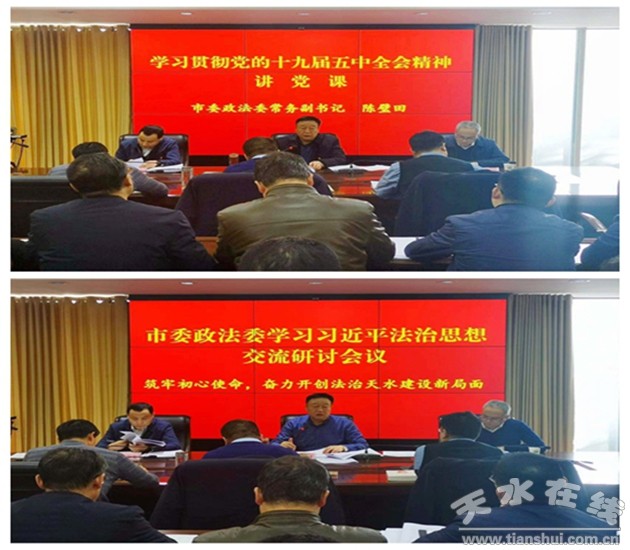 12月10日,天水市委政法委召開(kāi)學(xué)習(xí)貫徹黨的十九屆五中全會(huì)精神講黨課暨學(xué)習(xí)習(xí)近平法治思想交流研討會(huì)。市委政法委常務(wù)副書(shū)記陳壁田主持會(huì)議并講黨課,市委政法委領(lǐng)導(dǎo)班子成員和市綜治中心、市法學(xué)會(huì)主要負(fù)責(zé)人結(jié)合工作實(shí)際開(kāi)展交流發(fā)言,市委政法委全體黨員干部參加會(huì)議。