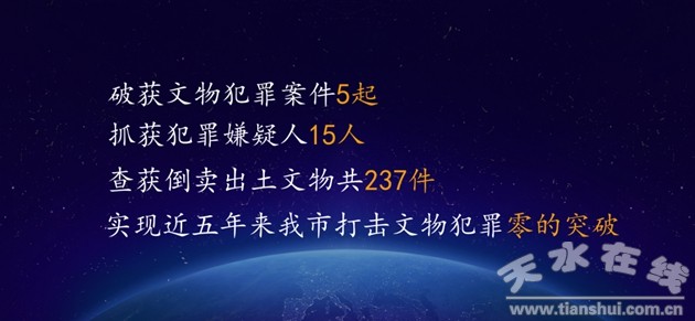 ——打擊文物犯罪取得突破。全市公安機(jī)關(guān)深入貫徹落實(shí)習(xí)近平總書(shū)記關(guān)于文物保護(hù)工作的重要指示精神,加強(qiáng)與各級(jí)文物部門(mén)密切配合、通力協(xié)作,持續(xù)開(kāi)展打擊文物犯罪,取得了豐碩戰(zhàn)績(jī)。相繼破獲張家川縣崔某等人涉嫌倒賣(mài)文物案、趙某等人盜掘古墓葬和倒賣(mài)文物案,破獲省公安廳督辦麥積區(qū)靜天高速公路施工段古墓被損毀案,共抓獲犯罪嫌疑人15名,查獲倒賣(mài)出土文物共237件,其中國(guó)家珍貴二級(jí)文物1件、三級(jí)文物18件、一般文物218件,實(shí)現(xiàn)了近五年來(lái)天水打擊文物犯罪零的突破,為全市和全省打擊文物犯罪專(zhuān)項(xiàng)行動(dòng)作出了積極貢獻(xiàn)。