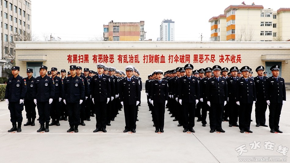 升旗儀式現(xiàn)場氣氛隆重?zé)崃,背景屏上“‘鑄魂強(qiáng)基、擎旗奮進(jìn)’天水市公安局警旗升旗儀式”字樣格外醒目,參加儀式的全體民警身姿挺拔、精神抖擻、整齊列隊。升旗儀式在莊嚴(yán)的《中華人民共和國國歌》聲中開始。按照指揮員鏗鏘有力的口令,在護(hù)旗手的護(hù)衛(wèi)下,升旗手邁著雄健的步伐,手擎中國人民警察警旗走向升旗臺。當(dāng)《中國人民警察警歌》奏響時,全體民警向警旗敬禮,齊唱警歌,目視警旗徐徐升起。