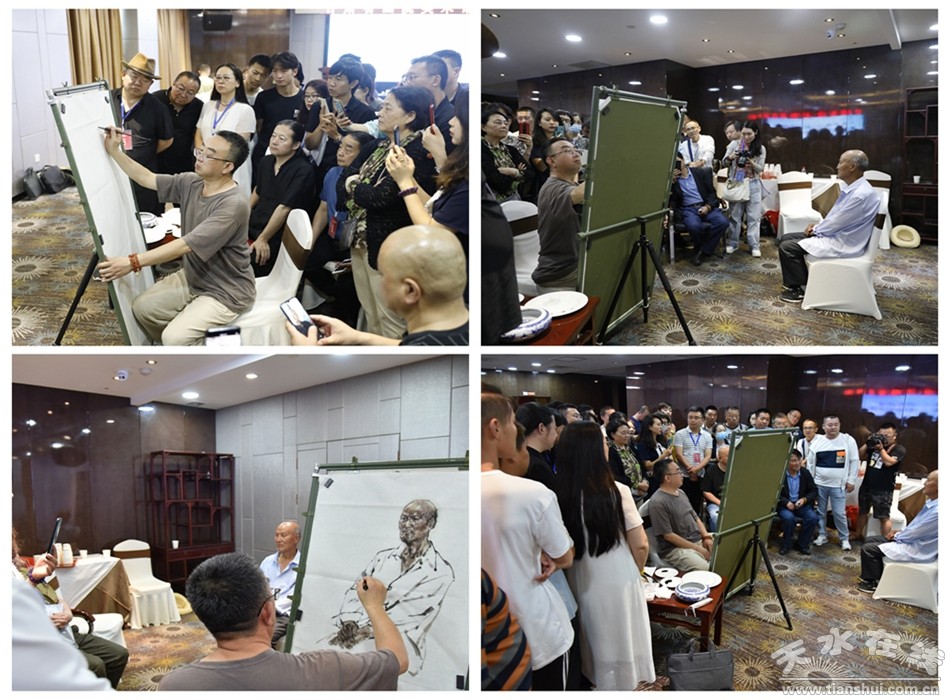王院長(zhǎng)通過(guò)多媒體播放配合講解的方式從意筆人物畫(huà)的歷史溯源、現(xiàn)當(dāng)代意筆人物畫(huà)的發(fā)展及現(xiàn)狀、藝術(shù)特征、寫(xiě)生步驟、創(chuàng)作步驟等五個(gè)方面為現(xiàn)場(chǎng)聽(tīng)眾做了深入淺出的闡釋。從他自身的創(chuàng)作經(jīng)歷、創(chuàng)作節(jié)點(diǎn)切入,與大家分享了他的一些創(chuàng)作理念、方法以及創(chuàng)作的過(guò)程,并以現(xiàn)場(chǎng)人物寫(xiě)生的方式生動(dòng)直觀地展示了整個(gè)作品從立意、素材的選取、草圖到作品呈現(xiàn)的整個(gè)過(guò)程。一番講解后,王院長(zhǎng)開(kāi)始了現(xiàn)場(chǎng)示范寫(xiě)生,先運(yùn)用速寫(xiě)的方式大致畫(huà)形,將速寫(xiě)融入到了意筆水墨人物畫(huà)中,并將中國(guó)畫(huà)的筆墨、線條發(fā)揮的淋漓盡致,充分體現(xiàn)出了筆墨的寫(xiě)意性,使畫(huà)面中的人物形象十分生動(dòng)鮮活,經(jīng)過(guò)一個(gè)小時(shí)的邊講解邊示范一張生動(dòng)的意筆人物作品呈現(xiàn)在大家眼前,博得了大家熱烈的掌聲。