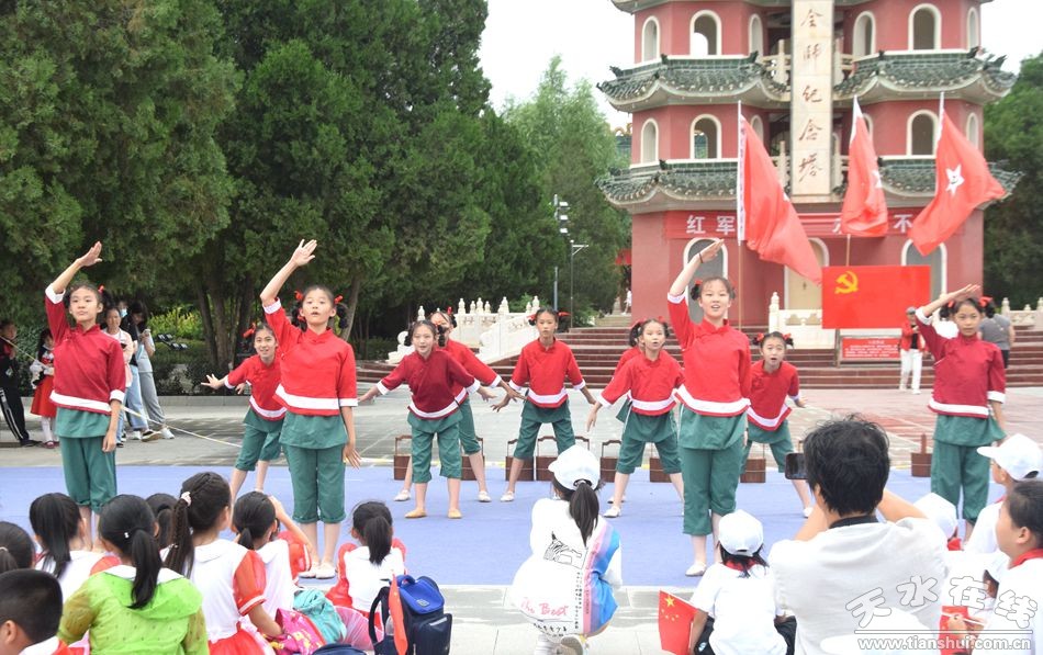 參觀結(jié)束后,同學(xué)們還在會師紀(jì)念塔前表演了歌舞《我仰望五星紅旗》、《吃水不忘挖井人》、《戰(zhàn)地紅花》和秦腔戲曲唱段《紅燈記》等紅色小節(jié)目,贏得現(xiàn)場群眾陣陣掌聲。
