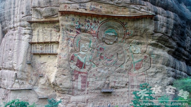 水簾洞石窟群位于甘肅省天水市武山縣城東北25公里處的魯班峽谷中,以高達(dá)42.3米的摩崖浮雕造像而著名。石窟群始建于十六國后秦時(shí)期,由水簾洞、拉梢寺、千佛洞、顯圣寺四個(gè)單元構(gòu)成,還保存有北魏以來的精美壁畫和彩塑。新華社記者 何問 攝
