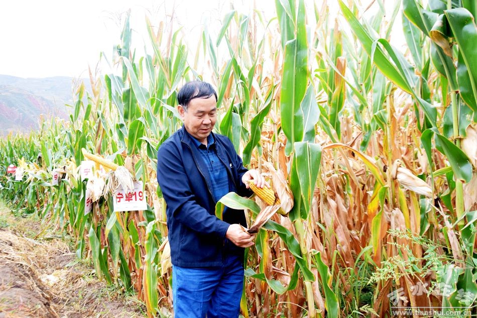 (天水市種子站站長、農(nóng)業(yè)技術(shù)推廣研究員郭四拜在察看玉米長勢。)
