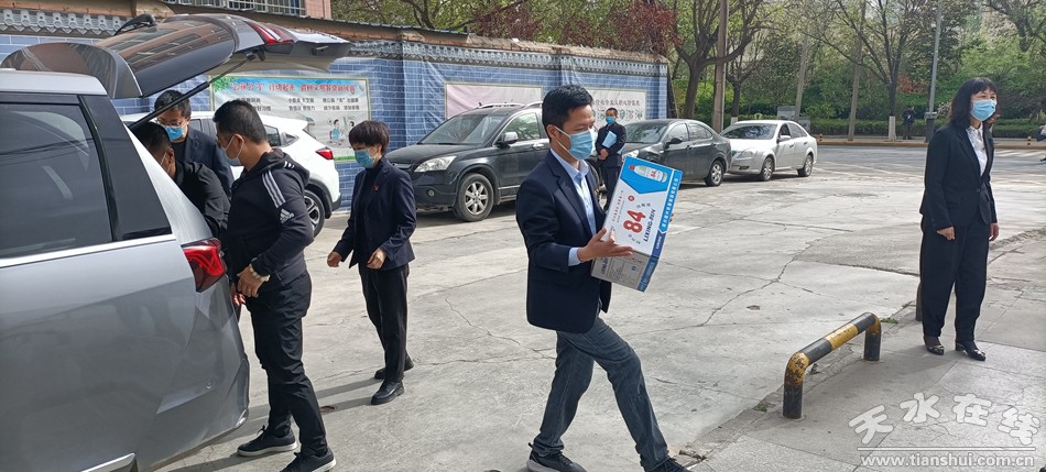 4月13日上午,中國建設銀行天水市分行高級客戶經(jīng)理李衛(wèi)萍同市建行住房金融部門負責人趙建文等相關人員為市住房公積金管理中心一線抗疫人員送來抗疫用品。