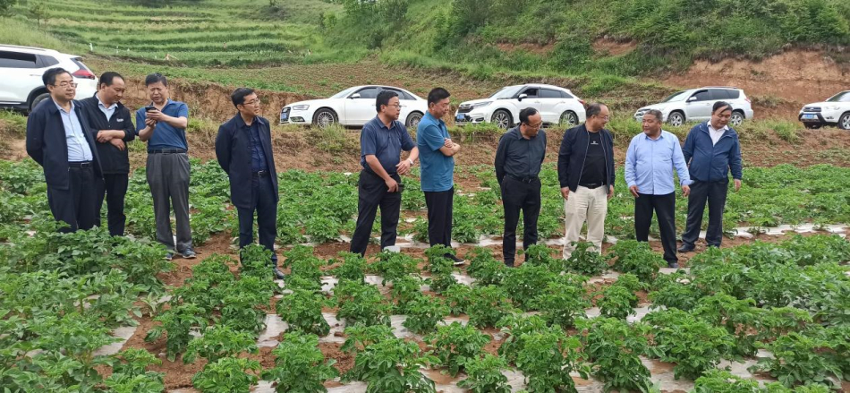 ▲6月9日上午,觀摩西和縣河壩鎮(zhèn)馬鈴薯品種試驗示范,隴南市農(nóng)業(yè)農(nóng)村局副局長黃輝(左五)陪同考察。