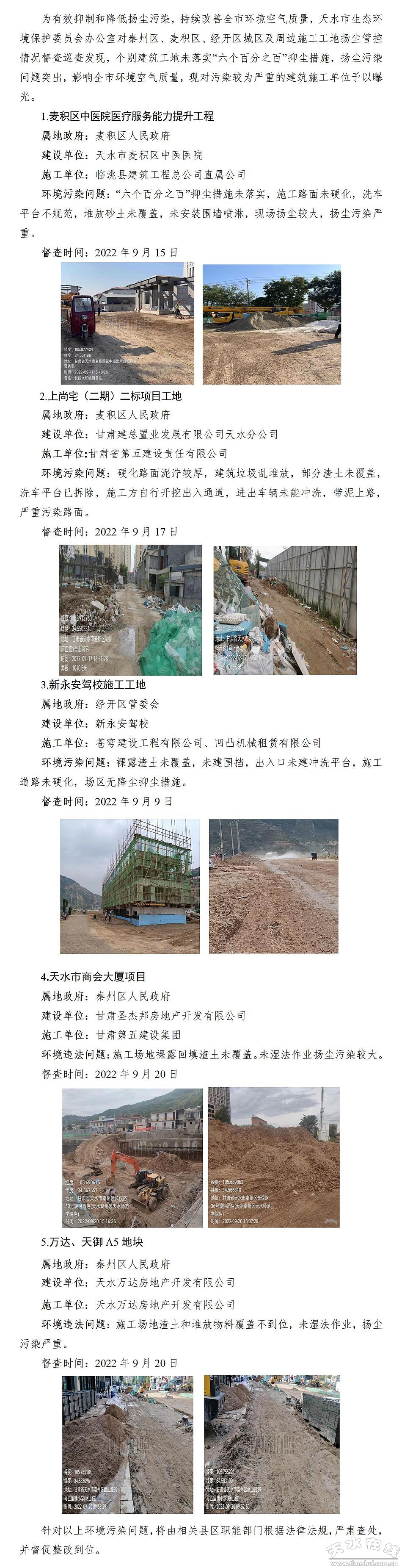 天水市生態(tài)環(huán)境保護委員會辦公室對施工工地環(huán)境污染問題的曝光(圖)