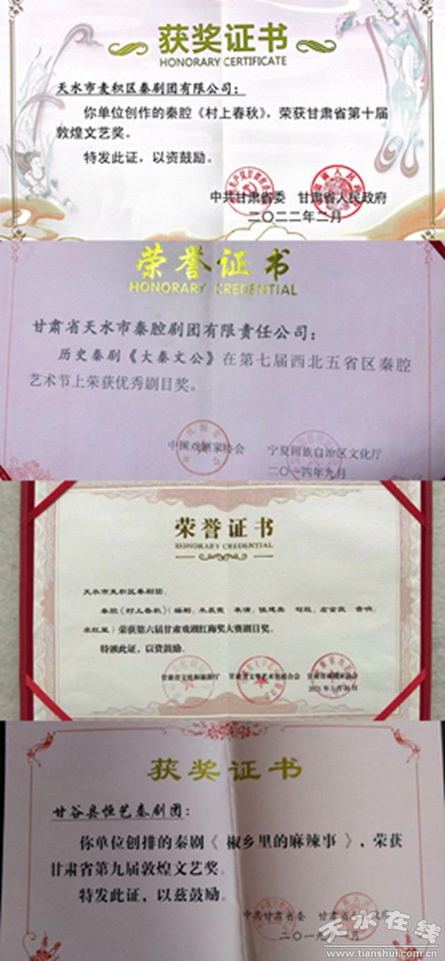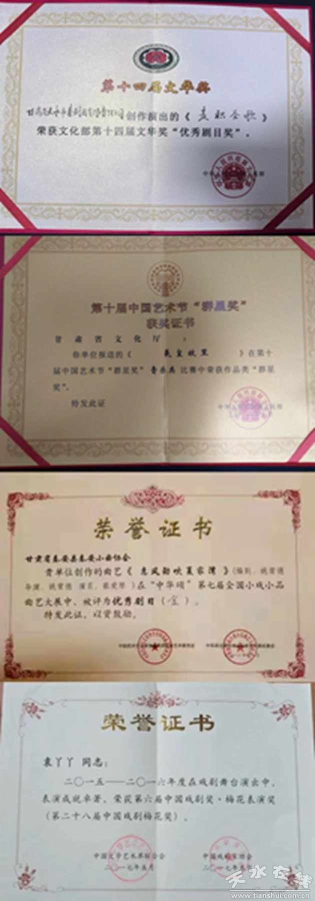 榮獲國家級(jí)獎(jiǎng)項(xiàng)5個(gè)!尔湻e圣歌》榮獲第十屆中國藝術(shù)節(jié)第十四屆“文華優(yōu)秀劇目獎(jiǎng)”,歌曲《羲皇故里》、春節(jié)系列文化活動(dòng)“和諧之春”分別榮獲第十六屆音樂類“群星獎(jiǎng)”和項(xiàng)目類“群星獎(jiǎng)”,秦安小曲《惠風(fēng)勁吹夏家灣》獲得第七屆全國小戲小品大賽優(yōu)秀劇目金獎(jiǎng),袁丫丫榮獲第28屆中國戲劇梅花獎(jiǎng),成為我市第一朵梅花。榮獲省級(jí)獎(jiǎng)項(xiàng)31個(gè)。話劇《鄧寶珊將軍》榮獲甘肅省第七屆敦煌文藝獎(jiǎng),秦腔歷史劇《大秦文公》榮獲第七屆中國秦腔藝術(shù)節(jié)“優(yōu)秀劇目獎(jiǎng)”,舞劇《一畫開天》榮獲第四屆甘肅省戲劇紅梅劇目大獎(jiǎng),秦腔現(xiàn)代戲《椒鄉(xiāng)里的麻辣事》榮獲甘肅省第九屆敦煌文藝獎(jiǎng),秦腔現(xiàn)代戲《村上春秋》、油畫《秦安縣的正月十三》榮獲甘肅省第十屆敦煌文藝獎(jiǎng);小品《家》《幸福柳》《梅香怡人》等分別榮獲甘肅省第二屆、第三屆小品大賽一等獎(jiǎng)、二等獎(jiǎng)。廣場(chǎng)舞《天河熱土》榮獲2020年甘肅省“金色的田野”鄉(xiāng)村廣場(chǎng)舞大賽一等獎(jiǎng)等。