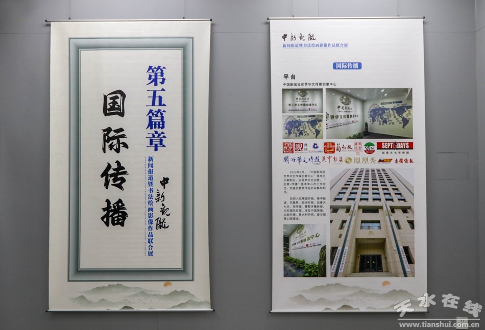 本次展覽結(jié)合中新社日常采寫的新聞作品,通過“新聞+古詩詞”“新聞+書法”“新聞+繪畫”的形式,將新聞報道和傳統(tǒng)書畫藝術(shù)結(jié)合起來再創(chuàng)作,探索創(chuàng)新新聞報道和傳統(tǒng)書畫藝術(shù)的融合表達,著力講好甘肅故事、天水故事。