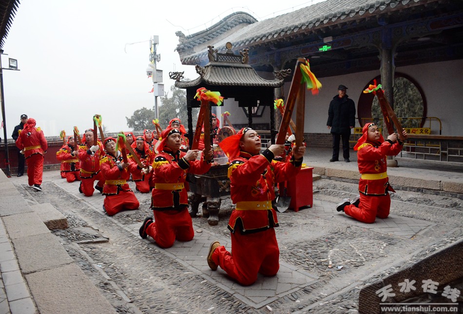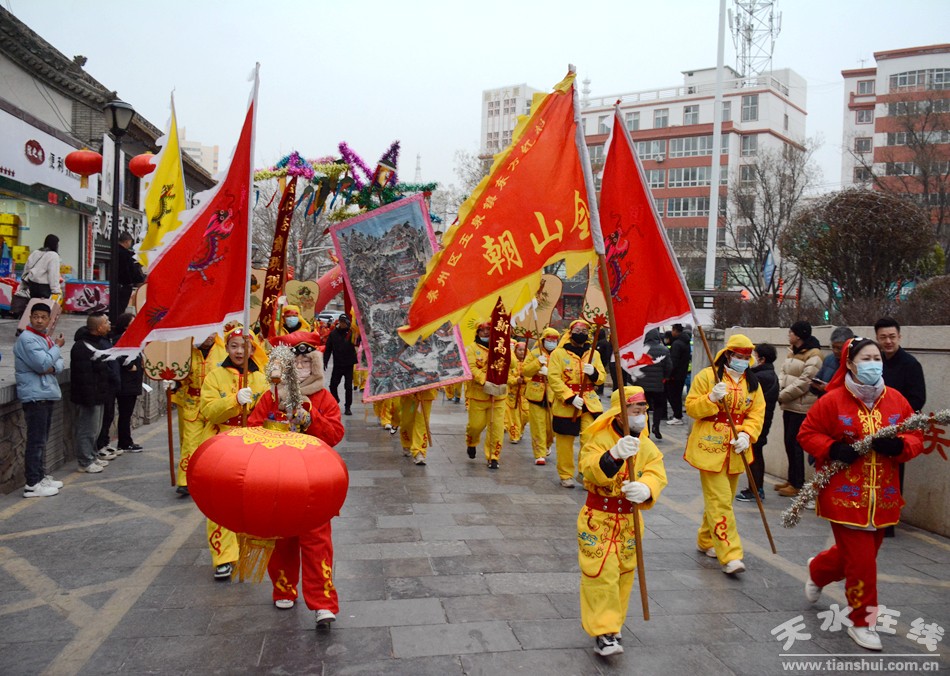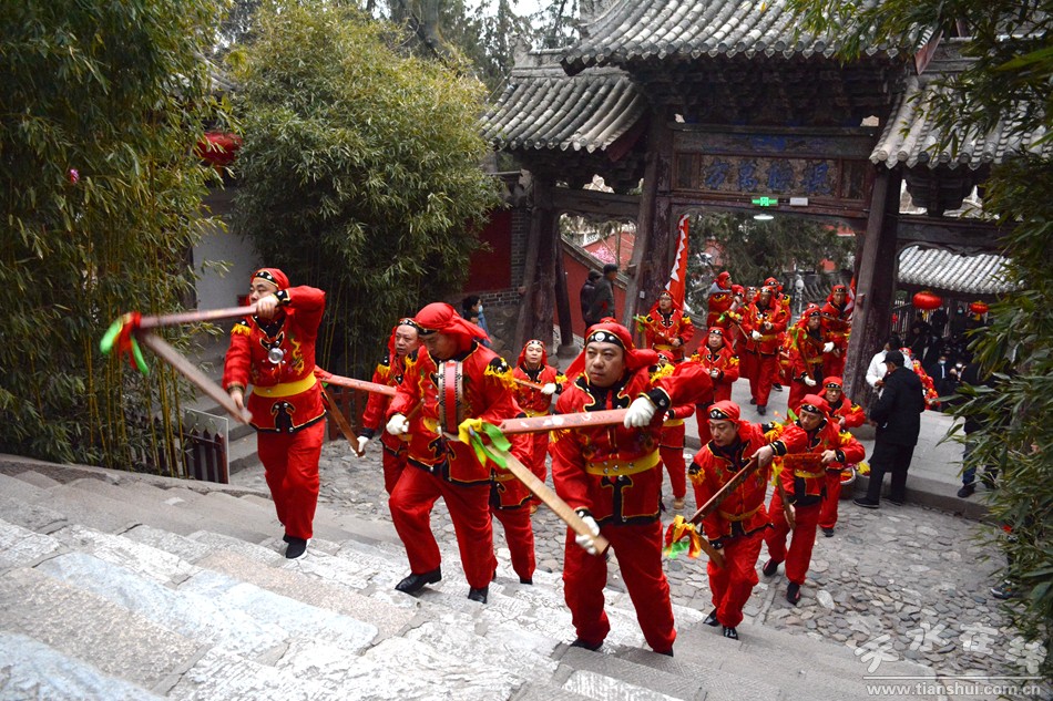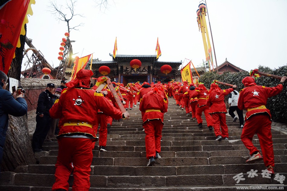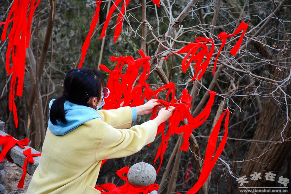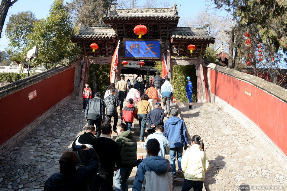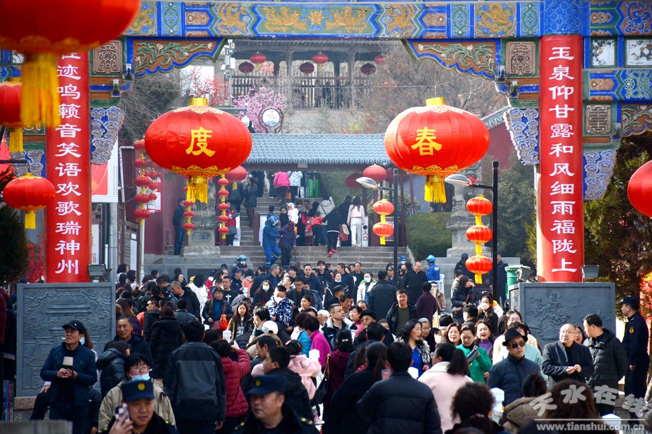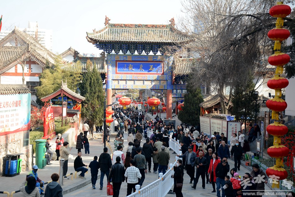 2月17日18日,農(nóng)歷正月初八初九,秦州區(qū)玉泉觀迎來一年一度的“朝觀”廟會。玉泉觀景區(qū)內(nèi)大紅燈籠高掛,數(shù)萬民眾扶老攜幼來到玉泉觀,綁紅繩、摸香爐,以祈福新的一年身體健康、全家幸福、國泰民安!吧暇懦^”是天水人約定俗成的古老風(fēng)俗,也是古城天水年俗文化活動的重要內(nèi)容之一,每年正月初八、初九都有數(shù)以萬計(jì)的民眾前來朝觀祈福。