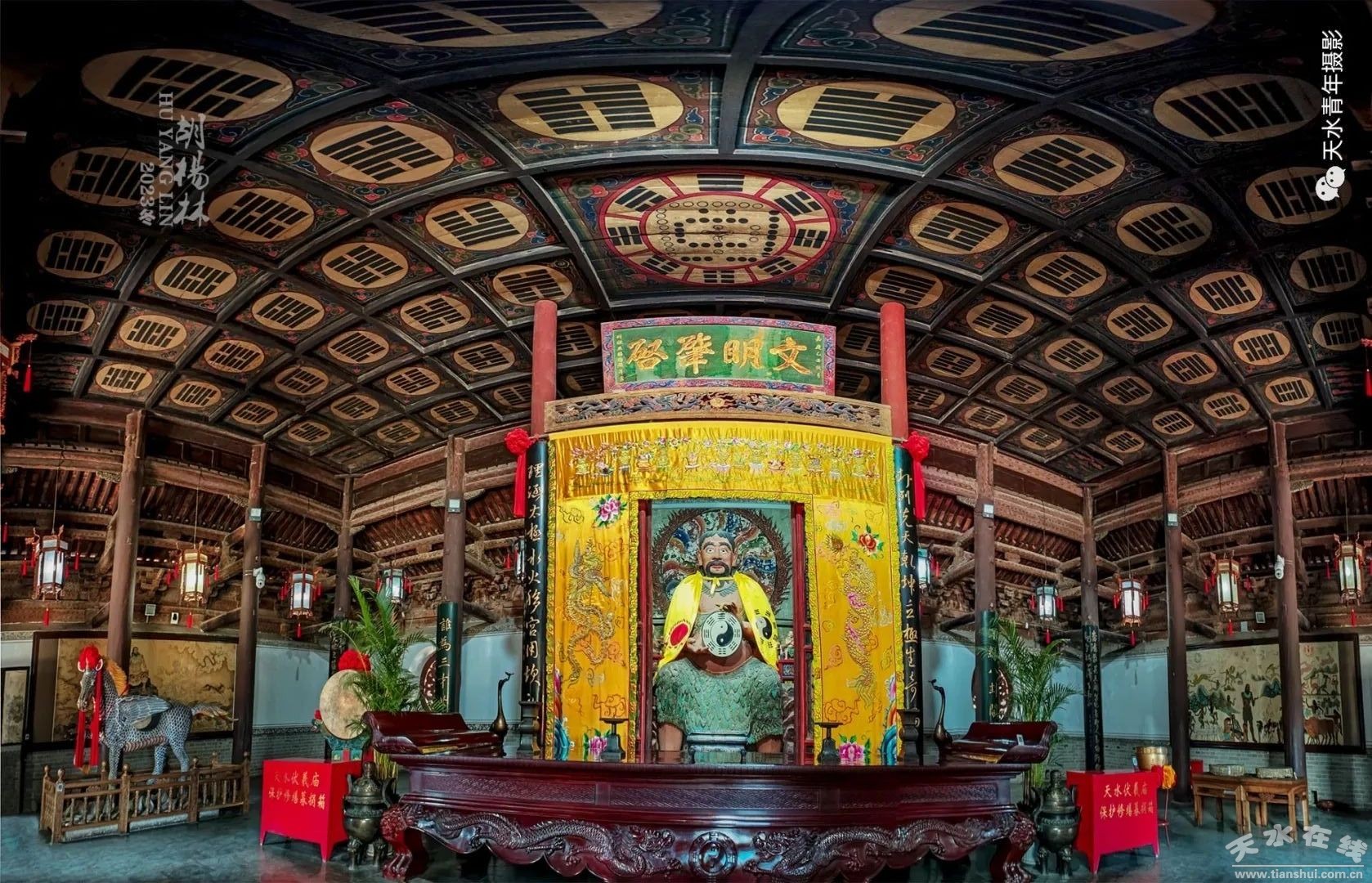 【打卡伏羲廟】天水伏羲廟又名“太昊宮”,是一座專門(mén)祭祀中華民族偉大的人文始祖太昊伏羲氏的明清宗廟建筑群,F(xiàn)存建筑建于明成化十九年(公元1483年),總占地面積35000平方米,是目前我國(guó)保存最為完整、建筑年代最早的祭祀伏羲氏的廟宇,被人們尊稱為“華夏第一廟”,F(xiàn)為全國(guó)重點(diǎn)文物保護(hù)單位,國(guó)家4A級(jí)旅游景區(qū)。伏羲廟整體建筑坐北朝南,四進(jìn)六院,具有典型的中國(guó)古代宮廷式建筑格局。主體建筑先天殿內(nèi)現(xiàn)存明代伏羲泥塑彩繪巨像,身高三米,手托先天八卦盤(pán),威儀古樸,儼然一位古代圣者的形象。殿內(nèi)天花彩繪河圖居中的先天八卦和六十四卦方位圖,在國(guó)內(nèi)古建筑中絕無(wú)僅有。太極殿盡間明代木質(zhì)窗欞透雕團(tuán)龍、團(tuán)鳳,雕刻精湛,栩栩如生,具有很高的藝術(shù)價(jià)值,是我國(guó)木雕藝術(shù)的精品。伏羲廟內(nèi)有64株古柏,以64卦方位栽植,另有千年槐樹(shù)一株。老樹(shù)參天,柏影掩映,鳥(niǎo)雀翔集,情趣盎然。
