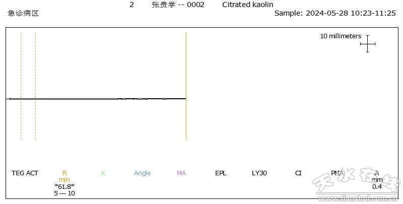 血栓彈力圖檢驗(yàn),備注:K值、Angel、MA、LY30、EPL均測不出,提示凝血呈纖溶亢進(jìn)狀態(tài)