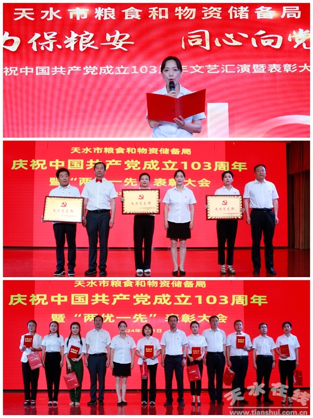 7月1日,天水市糧食和儲備局舉辦“凝心聚力保糧安同心向黨創(chuàng)輝煌”慶祝中國共產(chǎn)黨成立103周年文藝匯演暨表彰大會,謳歌黨的豐功偉績和光輝歷程,表彰市直糧儲系統(tǒng)優(yōu)秀共產(chǎn)黨員、優(yōu)秀黨務工作者和先進黨支部,表彰甘肅省糧食和物資儲備系統(tǒng)百萬職工安全倉儲管理技能競賽優(yōu)秀參賽選手,市糧食和物資儲備局領導班子成員及全體黨員干部,市糧食和物資保障中心、市糧油防治檢驗中心、市救災物資儲備中心和市第一糧庫有限公司、市軍糧供應有限公司干部職工共計150余人參加。