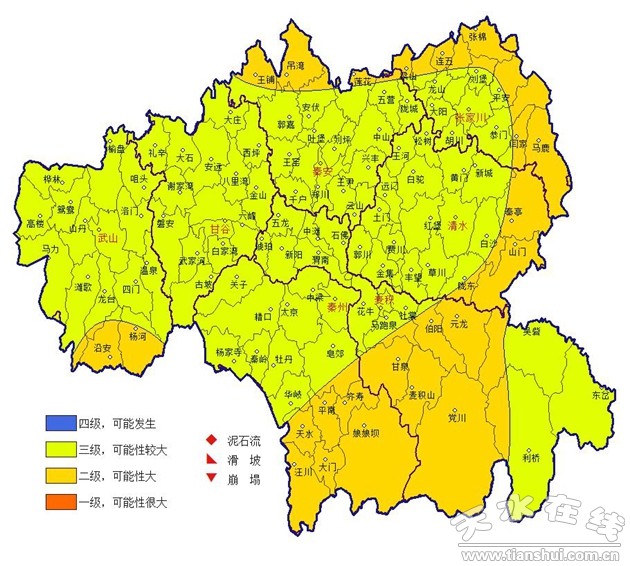 過去24小時,全市出現(xiàn)大到暴雨天氣,秦州區(qū)南部、麥積區(qū)中東部、清水縣東部、張家川縣北部與東南部、秦安縣北部、武山縣南部出現(xiàn)大暴雨,其中秦州區(qū)娘娘壩鎮(zhèn)出現(xiàn)特大暴雨,累積雨量達283.6毫米。預計今天白天仍有小雨天氣,受持續(xù)性降水影響,未來24小時上述地區(qū)發(fā)生地質(zhì)災害的氣象風險高(橙色預警),請相關縣區(qū)做好監(jiān)測預警,加強崩塌、滑坡、泥石流等地質(zhì)災害的應對防范工作。