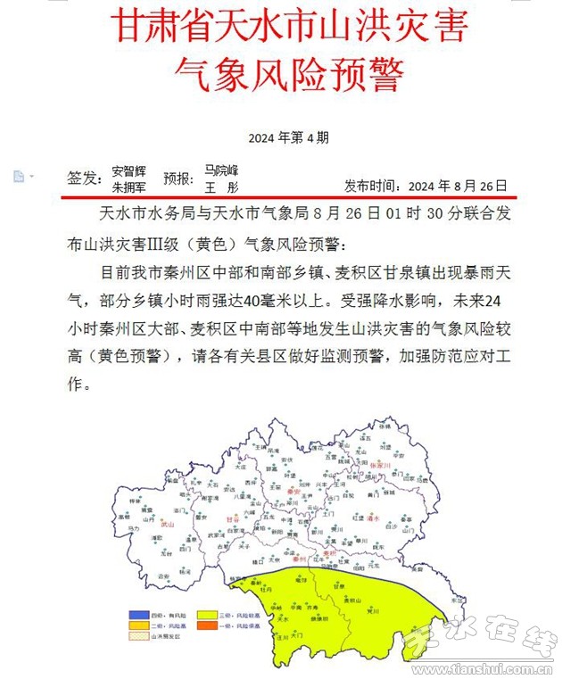 ·天水市山洪災(zāi)害Ⅲ級(黃色)氣象風(fēng)險(xiǎn)預(yù)警·水利部和中國氣象局聯(lián)合發(fā)布橙色山洪災(zāi)害氣象預(yù)警