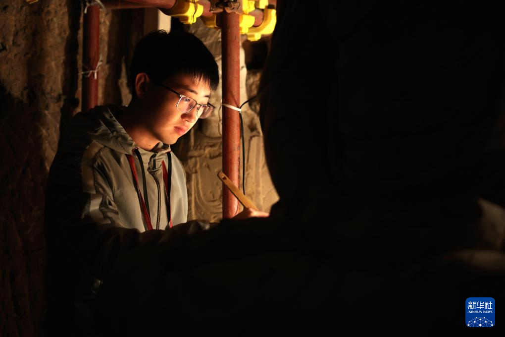 麥積山石窟藝術(shù)研究所數(shù)字中心主任董廣強(qiáng)在查看麥積山石窟的壁畫(huà)雕塑(11月2日攝)。
