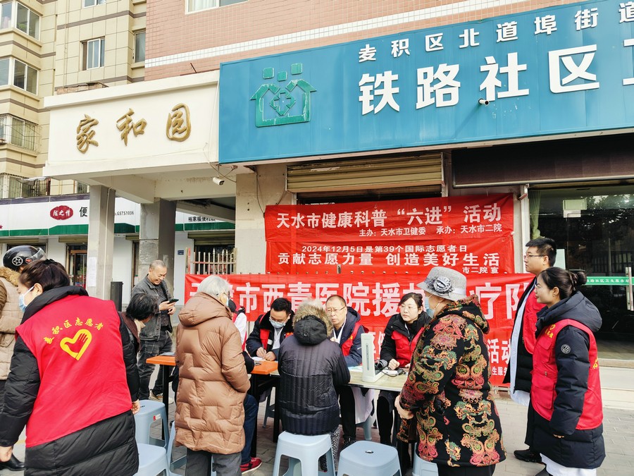 12月5日是第39個(gè)國際志愿者日,為進(jìn)一步弘揚(yáng)“奉獻(xiàn)、友愛、互助、進(jìn)步”的志愿精神,傳播科學(xué)的醫(yī)療知識(shí),當(dāng)日,天水市第二人民醫(yī)院到鐵路社區(qū)服務(wù)站門前開展了以“貢獻(xiàn)志愿力量,創(chuàng)造美好生活”為主題的義診活動(dòng);顒(dòng)由院團(tuán)委和公共衛(wèi)生科牽頭組織,天津西青醫(yī)院幫扶專家、心內(nèi)科一病區(qū)、神經(jīng)內(nèi)科二病區(qū)和體檢中心等科室專家積極參與。