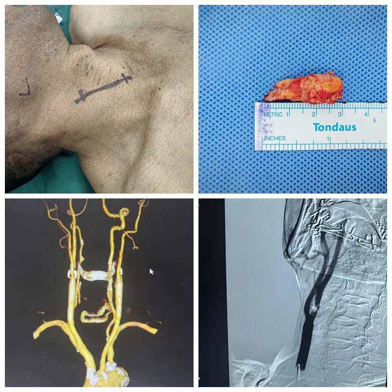 患者男,64歲,因左側肢體無力麻木等癥狀到市二院就診,經(jīng)頸動脈超聲、CT 血管造影(CTA)及血管造影(DSA)等詳細檢查后,被確診為右側頸內動脈重度狹窄。神經(jīng)外科團隊對患者病情進行了全面評估,與患者及家屬充分溝通后,決定為其實施頸動脈內膜狹窄剝脫手術。在上級醫(yī)院專家的指導和手術麻醉科等相關科室的密切配合下,順利地將患者頸動脈內增厚的內膜及斑塊完整剝離,成功恢復頸動脈的正常管徑和血流。手術歷時約2小時,術程順利,患者安返病房后生命體征平穩(wěn),左側肢體麻木無力等癥狀明顯改善。術后48小時內未出現(xiàn)任何并發(fā)癥,患者及家屬對手術效果非常滿意,并對市二院神經(jīng)外科團隊的高超醫(yī)術和優(yōu)質服務給予了高度評價。