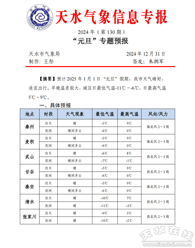 天水市氣象局發(fā)布“元旦”專題預(yù)報(bào)