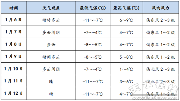 預(yù)計(jì)本周天水以晴或多云為主,無明顯降水天氣。氣溫預(yù)報(bào)以秦州區(qū)為例,日最低氣溫-7~-4℃,日最高氣溫4~9℃。