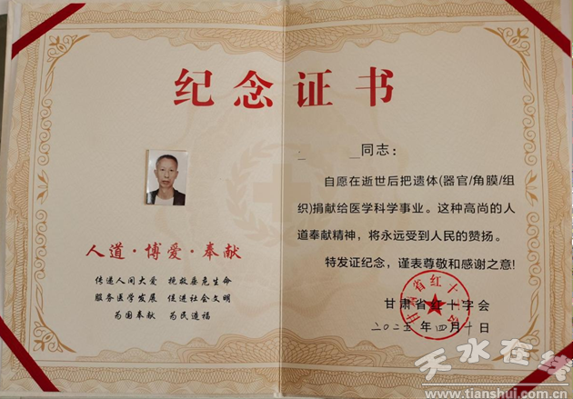 家人雖然悲痛萬分,但最終還是選擇尊重并支持他的決定。他們聯(lián)系了天水紅十字會和甘肅省紅十字愛爾眼庫天水接收站的工作人員,在工作人員的協(xié)助下,順利完成了捐獻的相關手續(xù)。在天水市紅十字會宋秘書長和甘肅省紅十字愛爾眼庫天水接收站的工作人員的見證下,于2025年4月10日,在生命的最后一刻,鄧先生履行了他的承諾,將角膜捐獻給了接收站。