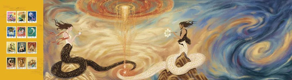 此次推出的紀念郵折設計匠心獨運,巧妙實現(xiàn)郵票與繪畫的藝術融合。青年油畫藝術家王津銳以現(xiàn)代審美重構伏羲女媧創(chuàng)世場景,通過光影交織的筆觸與細膩構圖,將“一畫開天”“摶土造人”等神話故事轉化為可感知的視覺語言:八卦圖騰的神秘符號、結繩為網(wǎng)的生活圖景、先民觀象授時的智慧瞬間,皆在方寸之間鮮活呈現(xiàn)。郵折不僅是對歷史文明的藝術再現(xiàn),更深入挖掘文化符號背后的哲學內涵,讓觀者在欣賞藝術之美的同時,觸摸到中華文明的精神內核。