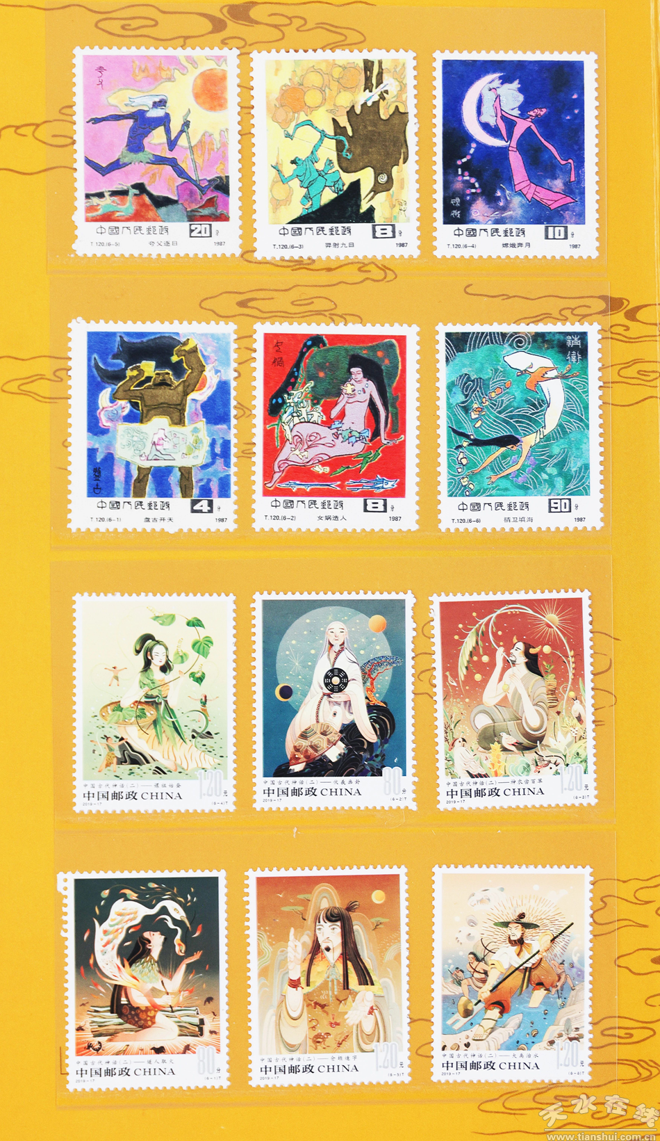 1987年《中國古代神話》郵票:全套6枚,以盤古開天、女媧造人、羿射九日、嫦娥奔月、夸父追日、精衛(wèi)填海為主題,設計上既堅守民族氣派,又融合民間與國外繪畫中夸張生動的元素,雅俗共賞并注入現(xiàn)代審美,讓遠古神話以鮮活姿態(tài)呈現(xiàn)。