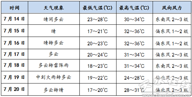 預(yù)計(jì)未來一周我市以晴或多云天氣為主,其中18日夜間有雷陣雨,19日白天全市有一次中到大雨降水過程。14~17日全市有持續(xù)性高溫天氣。氣溫預(yù)報(bào)以秦州區(qū)為例,日最低氣溫20~23℃,日最高氣溫30~35℃。