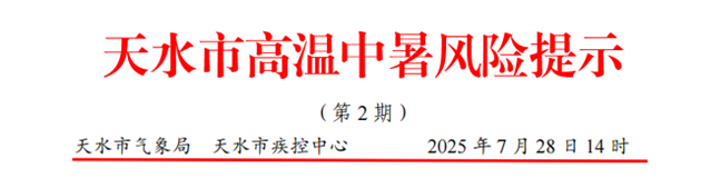 天水市氣象局、天水市疾控中心2025年7月28日14時聯(lián)合發(fā)布高溫中暑風(fēng)險提示: