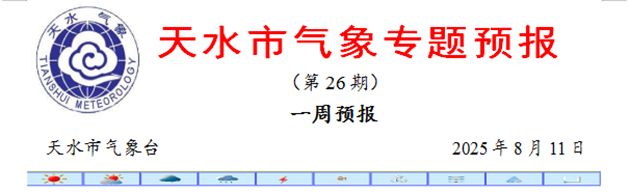 預計未來一周全市以晴或多云天氣為主,其中11日下午~12日上午有雷陣雨,局地伴有8級以上雷暴大風。氣溫預報以秦州區(qū)為例,日最低氣溫18~21℃,日最高氣溫31~33℃。