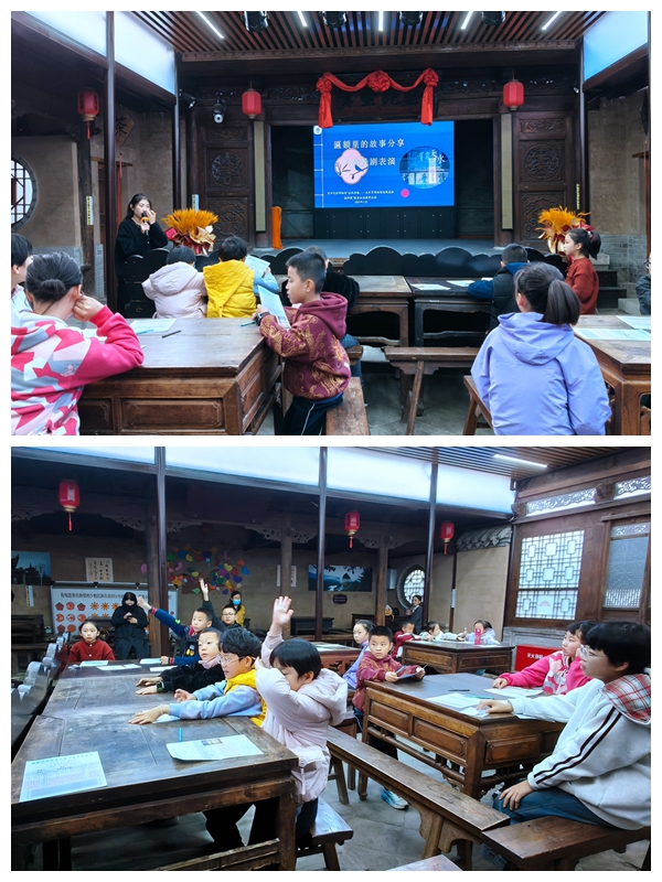故事分享課堂上,社教老師用生動的語言講述了其它知名匾聯(lián)的故事:如和珅與“天下第一關(guān)”匾額的趣聞、蘇軾題“快哉亭”的文人雅興、朱元璋題“國士無雙”的識人智慧,還有鄭板橋“吃虧是福”的處世哲學(xué)。故事剛落,孩子們便踴躍舉手,分享“程門立雪”“孔融讓梨”等典故,在交流中深化對“文字傳理”的理解。