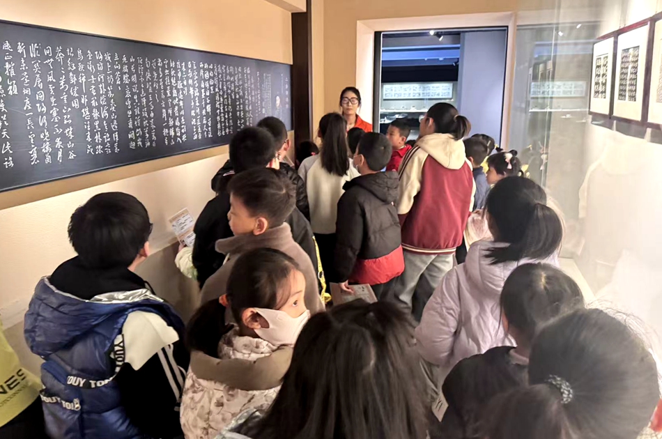 隨后,宣教老師帶領(lǐng)大家走進書畫碑拓展區(qū),圍繞館藏古代書法家真跡、珍貴拓片等展品,細致引導(dǎo)青少年感受筆墨線條的韻律之美,解析作品的創(chuàng)作背景與書法風(fēng)格,讓原本靜置展柜的文物化作可觸摸、可感知的“活教材”。