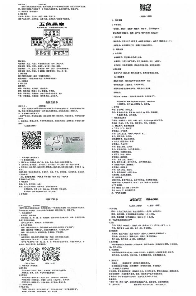 5、出院前:由責(zé)任護(hù)士根據(jù)患者體質(zhì)、疾病、節(jié)氣等定制專屬個(gè)性化專屬宣教單,出院前一天向患者及家屬詳細(xì)宣教相關(guān)內(nèi)容,指導(dǎo)針對(duì)疾病的飲食調(diào)護(hù)、節(jié)氣注意事項(xiàng)、簡(jiǎn)單的穴位按壓等要點(diǎn),并將八段錦及太極拳的操作視頻制作成二維碼,指導(dǎo)患者回家后堅(jiān)持練習(xí),最后標(biāo)注復(fù)診時(shí)間及科室電話號(hào)碼,方便患者有問題隨時(shí)聯(lián)系并按時(shí)進(jìn)行復(fù)診。