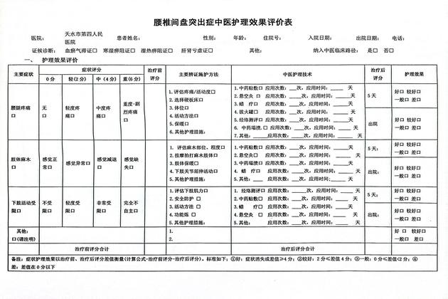 1、入院第一天:詳細(xì)詢問患者病史,與主管醫(yī)生積極溝通,針對(duì)不同疾病、證型、辯證施護(hù),動(dòng)態(tài)觀察病情變化,根據(jù)患者的癥狀、疼痛程度及所進(jìn)行的中醫(yī)適宜技術(shù),詳細(xì)記錄使用各項(xiàng)中醫(yī)適宜技術(shù)的名稱、次數(shù)、天數(shù)及效果評(píng)價(jià),進(jìn)行個(gè)性化指導(dǎo)。