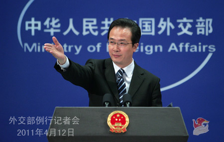 2011年4月12日外交部發(fā)言人洪磊舉行例行記者會。外交部網(wǎng)站。