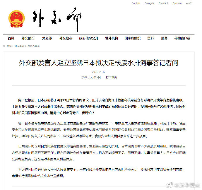 外交部發(fā)言人趙立堅(jiān)4月12日說(shuō),國(guó)際輿論對(duì)日方擬決定核廢水排海高度關(guān)注,普遍表示質(zhì)疑和反對(duì)。日本國(guó)內(nèi)也有不少?gòu)?qiáng)烈反對(duì)意見(jiàn)。我注意到日方經(jīng)常要求他國(guó)履行國(guó)際責(zé)任,現(xiàn)在國(guó)際社會(huì)都在看著日方,日方不能視而不見(jiàn)、聽(tīng)而不聞。中方已通過(guò)外交渠道向日方表明嚴(yán)重關(guān)切,要求日方切實(shí)以負(fù)責(zé)任的態(tài)度,審慎對(duì)待福島核電站核廢水處置問(wèn)題。