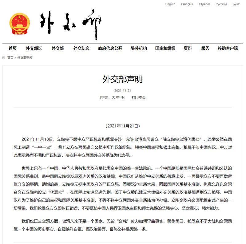 11月18日,立陶宛不顧中方嚴正抗議和反復(fù)交涉,允許臺灣當(dāng)局設(shè)立“駐立陶宛臺灣代表處”。此舉公然在國際上制造“一中一臺”,背棄立方在兩國建交公報中所作政治承諾,損害中國主權(quán)和領(lǐng)土完整,粗暴干涉中國內(nèi)政。中方對此表示強烈不滿和嚴正抗議,決定將中立兩國外交關(guān)系降為代辦級。