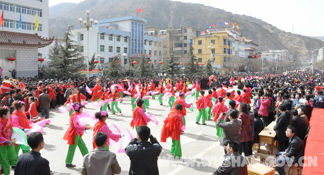 歡快的鑼鼓敲起來,喜慶的秧歌扭起來,2月28日(正月十五日),武山縣城鑼鼓喧天、人氣鼎沸,由各鄉(xiāng)鎮(zhèn)農(nóng)民、街道居民、機關(guān)干部、學(xué)校師生等組成的秧歌隊在這里舉行隆重匯演,風(fēng)趣幽默的舞蹈、花團錦簇的彩車、騰空飛舞的長龍、狂奔跳躍的雄獅和氣勢磅礴的旋鼓等地方特色鮮明、鄉(xiāng)土氣息濃厚的民俗文藝節(jié)目,巡演在縣城內(nèi)的主要街道和廣場上。他們以自己精彩的表演,強烈表達了對美好生活的熱愛與憧憬?h城大街小巷人頭攢動,熱鬧非凡,10萬多名群眾云集街頭,觀看這場以“和諧之春”為主題的秧歌匯演。