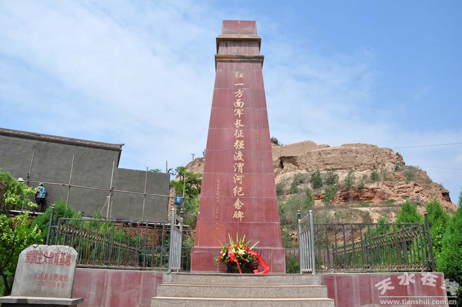 1935年9月20日,毛澤東率領的中央紅軍長征勝利到達哈達鋪,部隊整修后改編為陜甘支隊。休整兩天后,9月23日,主力紅軍從哈達鋪出發(fā),為了調離在渭河兩岸設防的敵軍主力,紅軍揚言東進,以迷惑敵人。向東北方向天水前進,作出佯進攻天水,威脅西安的樣子。天水守敵王鈞見狀,忙將沿渭河構成封鎖線的敵人主力向天水集中,致使沿渭河布防的敵軍大為削弱。24日晨,主力紅軍離開駐地岷縣閭井后,晝夜兼程,轉向西北方向,早把胡宗南部隊甩得遠遠的。所以,遠在百里之外的敵電臺報告說:“紅軍主力仍在哈達鋪,有向西和、禮縣進擾模樣”。這是紅軍出其不意行軍神速的真實寫照。此時紅軍突然調頭轉向西北,經岷縣紅崖,入漳縣黃家河村至新寺。因敵機騷擾,防空耽誤時間,紅軍星夜趕路,至25日拂曉,強行軍一百三十余里,到達新寺附近,為了迅速突破渭河封鎖線,紅軍仍未停步,跨越龍川河進入武山境內。經苗豐、楊坪、王家門、付家門行軍四十余里,到達鴛鴦鎮(zhèn)丁家門,部隊以極度疲勞,除派少數警戒外,部隊全體休息。紅軍行軍一晝夜半天,行程一百七十余里,中間僅吃了一頓飯。此時,駐扎在鴛鴦鎮(zhèn)大王廟的魯大昌一個連已調往天水。26日拂曉,司令部命令全軍,限上午九時前全部渡過渭河。經半天一夜的休息,疲勞已經消除,部隊在做渡河準備工作后,離開丁家門,沿榜沙河北進,到達渭河之濱的鴛鴦鎮(zhèn),分兩路縱隊渡河。時值深秋,因渭河水面較寬,河水不深,部隊又分幾路縱隊同時徒涉,很快就渡過了渭河。過河后,紅軍從容不迫的上了北山。武山、漳縣守敵聞訊趕到,兩岸槍聲齊鳴,機關槍、迫擊炮一齊開火,紅軍立即投入戰(zhàn)斗。據楊定華回憶,當時彭德懷問毛主席:“毛主席,情況怎么樣?”毛主席亦很自然地答到:“讓他們打好了,隨便派二個連人出去放幾響冷槍嚇嚇他,他不敢來的!闭奈鋬梢碇當彻婕炔桓覂擅鎶A擊,更不敢乘夜襲擊。紅軍行程三十余里,到達費家山、水溝一帶,露天宿營一夜。毛澤東在費家山費孝忠家中宿營一夜。9月27日清晨,紅軍離開費家山、水家溝一帶,翻蘇家大山,越祁家峴,沿著武山、隴西交界的山路向北挺進,經武山榆盤,過廟兒溝,下堡東一帶,入通渭縣史家廟到達榜羅鎮(zhèn)。 28日上午,中央紅軍在榜羅鎮(zhèn)召開連以上干部會議,毛澤東同志在大會上指出:任何反革命不能阻止紅軍去抗日!…,我們已經過了兩個關口,臘子口和渭河;現在還有一個關口,就是固原、平涼封鎖線。為著民族,為著使中國人不作亡國奴,奮勇向前!正式確定了把陜北作為紅軍的落腳點,并于10月19日進入陜北根據地,完成了史無前例的長征。 中央紅軍經過武山,沿途書寫了“抗日反蔣”、“打倒魯大昌”、“打倒蔣介石”等墻頭標語,他們嚴明的紀律給群眾留下了不可磨滅的印象。紅軍在費家山住了一夜,雖然天氣已很寒冷,但紅軍不入民房,晚上生著火露天宿營,借用群眾的東西,臨走時都放置得很整齊,一物一件不差。紅軍在武山期間 與群眾的關系都處得很好,買賣公平,深受武山地下黨及廣大群眾的歡迎和支持,群眾積極配合協(xié)助紅軍克服困難,戰(zhàn)勝敵人。費家山楊萬清親自拉自己的毛驢,幫助紅軍運送籌集的糧食到榜羅,他回來時紅軍還給了90元的川幣作為酬謝。柴宗孔領導的中共武山劉坪支部,組織“西北人民自衛(wèi)軍武山游擊隊”隊員,夜間破壞敵人修筑的碉堡等軍事設施在紅軍途徑的路邊砍放柳梢,以供紅軍為裝防空。丁家門群眾主動護送紅軍過漳河,鴛鴦鎮(zhèn)群眾給紅軍送羊只、借鐵鍋抬擔架、作向導,譜寫了擁軍愛民的篇章。