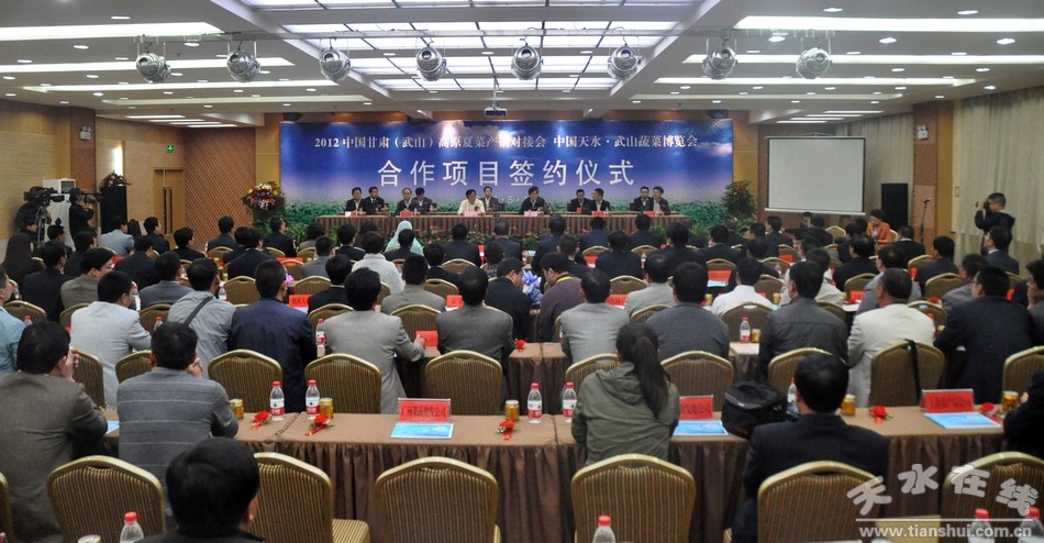 5月13日, 2012中國(guó)甘肅(武山)高原夏菜產(chǎn)銷對(duì)接會(huì)暨中國(guó)天水•武山蔬菜博覽會(huì)合作項(xiàng)目簽約儀式在武山隆重舉行。來(lái)自阿聯(lián)酋、巴基斯坦等國(guó)家的多家企業(yè)和北京、成都、浙江、甘肅、四川、廣東、山東、河南、新疆、湖北、福建等省市的客商和企業(yè)參與了合作項(xiàng)目簽訂。