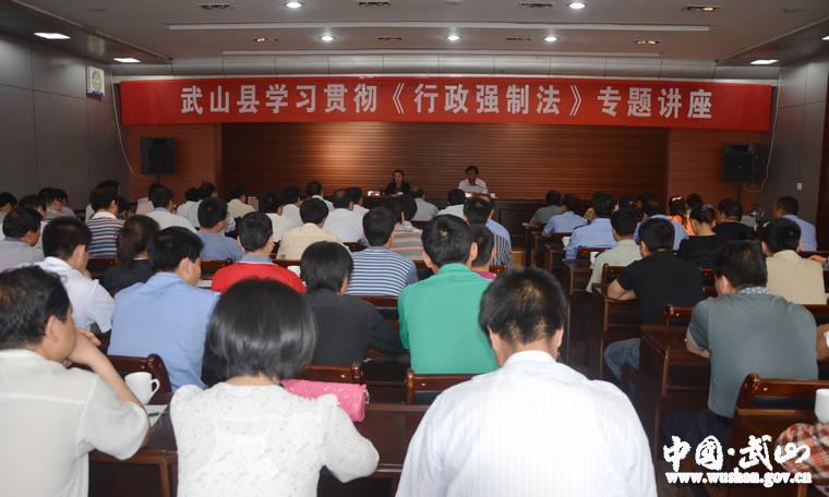 為了進(jìn)一步增強(qiáng)貫徹實(shí)施《行政強(qiáng)制法》的自覺(jué)性和責(zé)任感,準(zhǔn)確把握法律的基本精神和主要內(nèi)容,確保這部法律在全縣得到全面、準(zhǔn)確的貫徹落實(shí),6月15日,武山縣舉辦《行政強(qiáng)制法》專(zhuān)題講座。各鄉(xiāng)鎮(zhèn)、縣直各部門(mén)、雙管單位分管領(lǐng)導(dǎo)、法制員及業(yè)務(wù)骨干120多人聆聽(tīng)了講座。講座由副縣長(zhǎng)李菊霞主持。