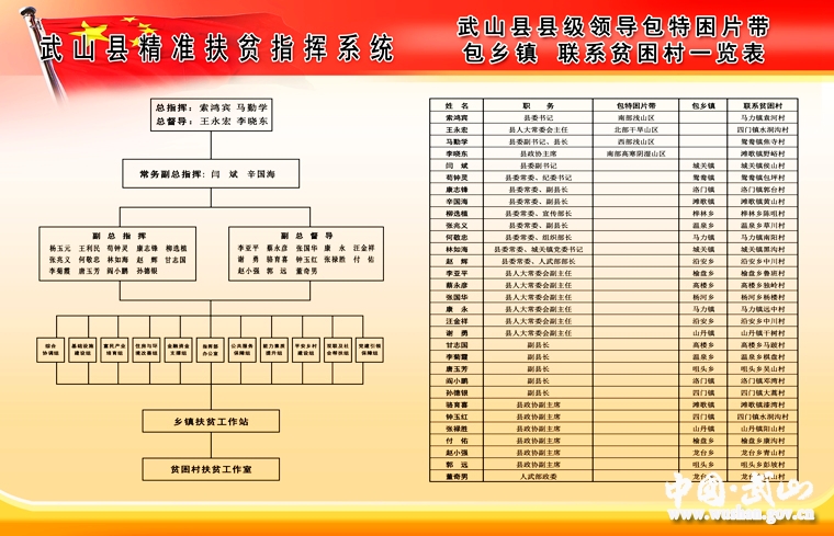 ——加強(qiáng)領(lǐng)導(dǎo)力量。成立了由縣委主要領(lǐng)導(dǎo)牽頭的精準(zhǔn)扶貧工作指揮部,組建了由常委、副縣長(zhǎng)任正副組長(zhǎng)的11個(gè)職能組室,建立了縣級(jí)領(lǐng)導(dǎo)包片、包鄉(xiāng)鎮(zhèn)、聯(lián)系貧困村的責(zé)任制,各鄉(xiāng)鎮(zhèn)成立了精準(zhǔn)扶貧領(lǐng)導(dǎo)小組和精準(zhǔn)扶貧工作站,一次性配齊了鄉(xiāng)鎮(zhèn)精準(zhǔn)扶貧工作站站長(zhǎng),形成了強(qiáng)有力的精準(zhǔn)扶貧組織領(lǐng)導(dǎo)體系。